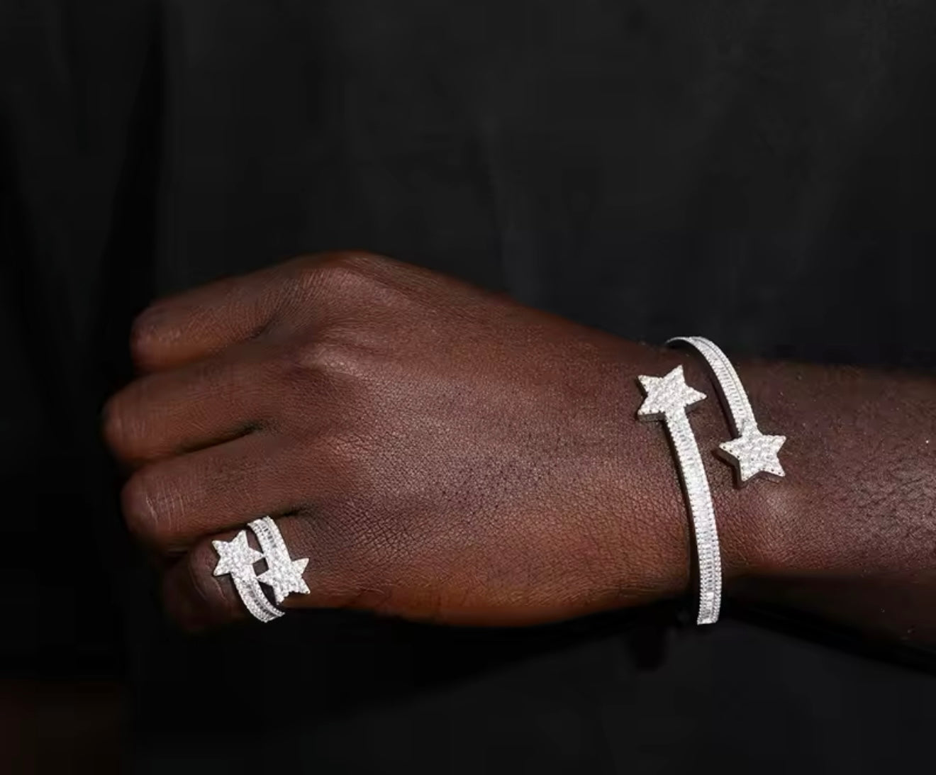 The Moissanite Star Bangle Ring is a statement of elegance, crafted for those who appreciate brilliance and luxury. Designed with precision, this ring features dazzling Moissanite stones that pass the diamond tester, offering the fire and clarity of real diamonds without the excessive price tag. Set on solid 925 sterling silver, it ensures durability and a tarnish-free shine, making it a lasting addition to any collection. The sleek bangle-inspired design adds a contemporary edge, seamlessly blending sophistication with everyday wear.