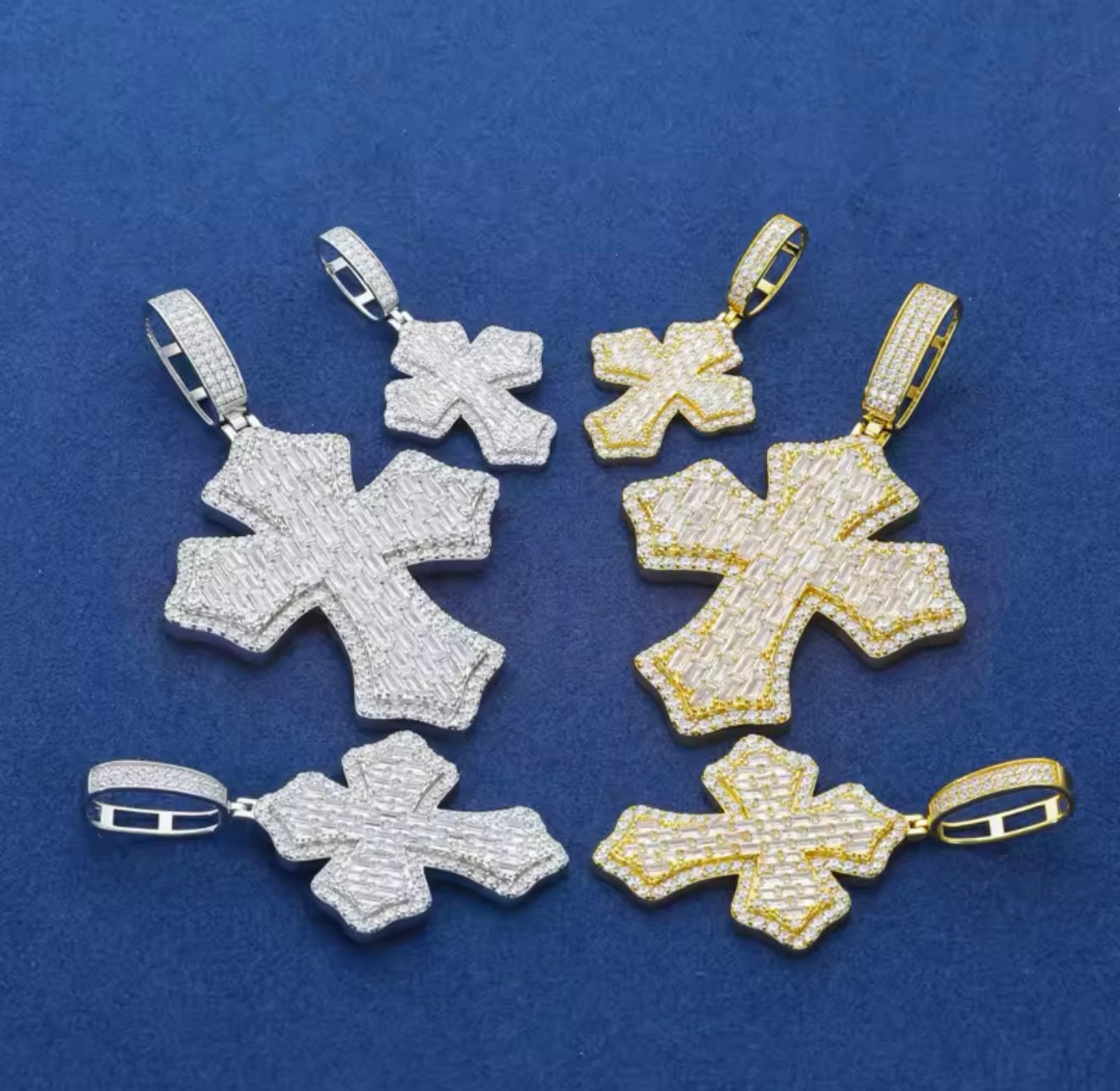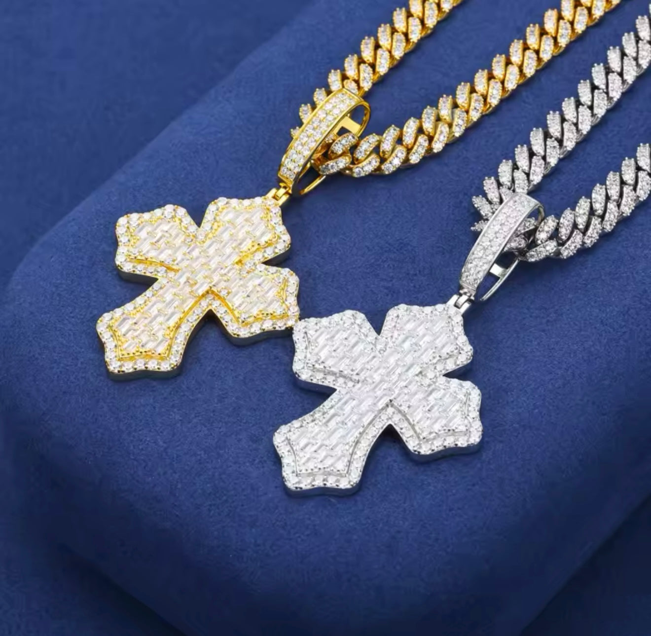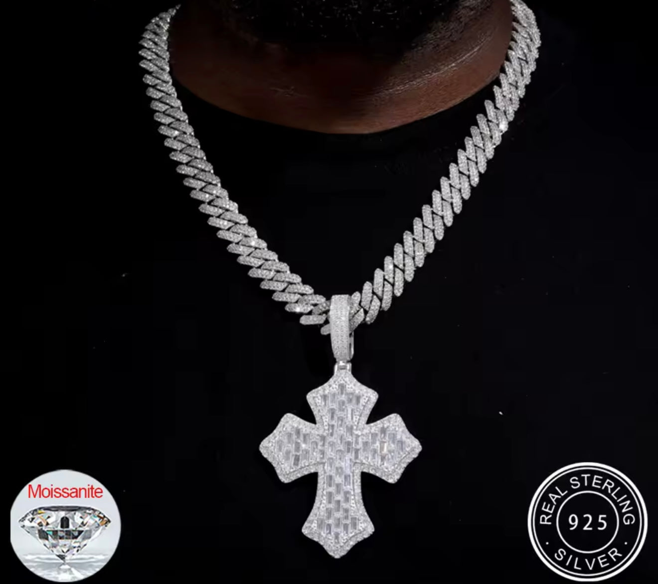 Elevate your look with the Moissanite Cross Baguette Pendant, a symbol of faith and luxury. Crafted with precision-cut baguette Moissanite stones, this pendant shines with brilliance and passes the diamond tester, giving you the ultimate statement piece.