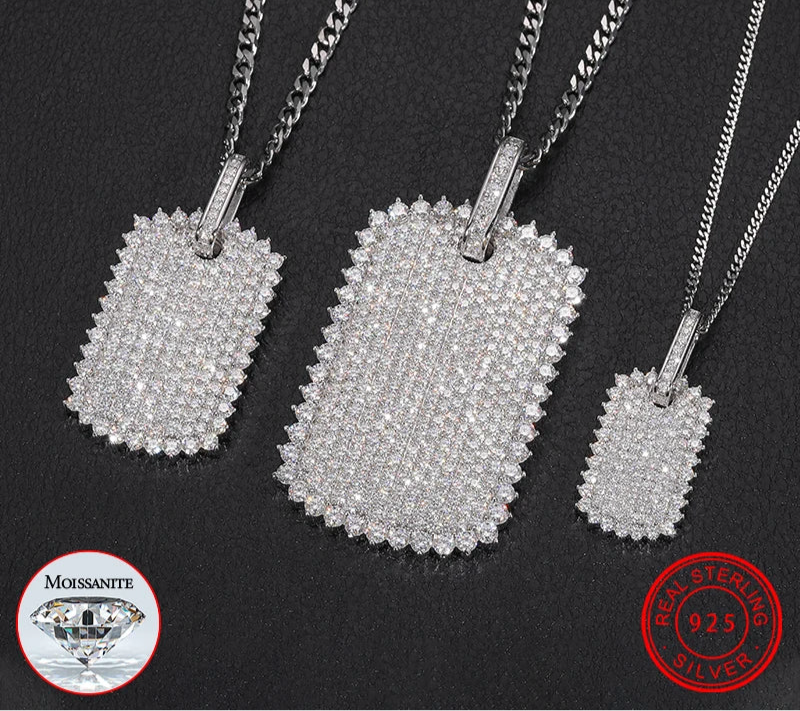 Elevate your style with timeless sophistication. Crafted in 925 sterling silver, this rectangular tag pendant is hand-set with VVS1 Moissanite stones that deliver unmatched brilliance and fire—passing the diamond tester with ease. Designed for those who demand both luxury and authenticity, this pendant balances bold minimalism with refined shine, making it the perfect statement piece for any occasion.