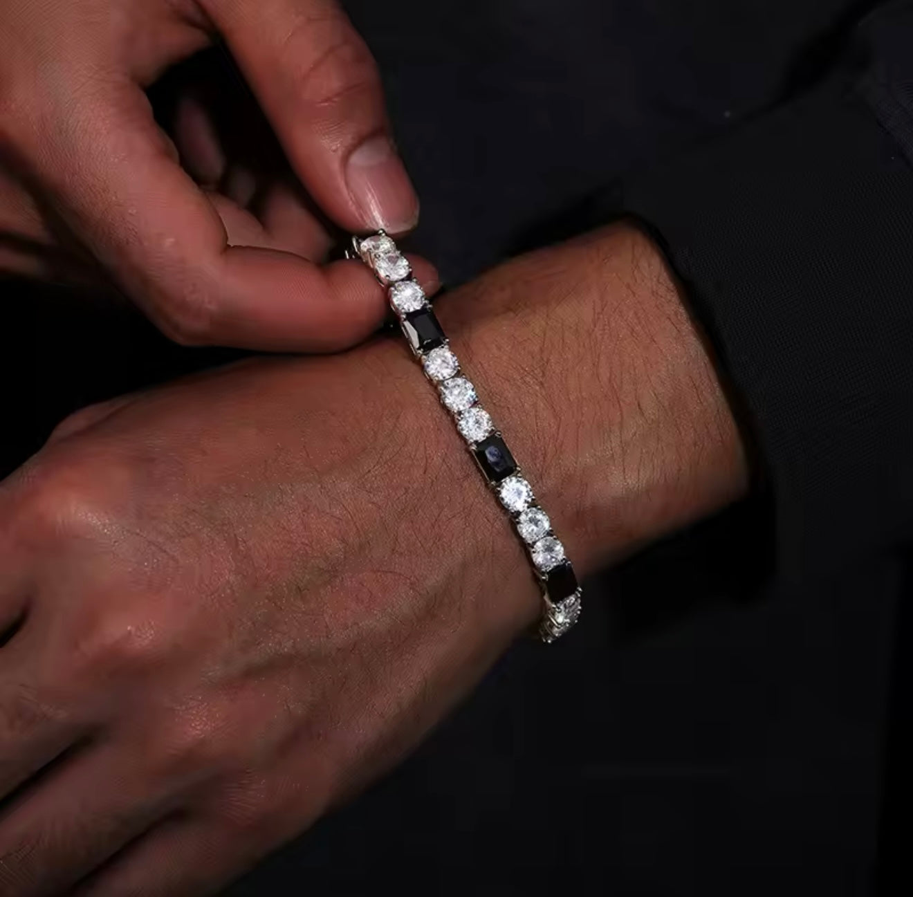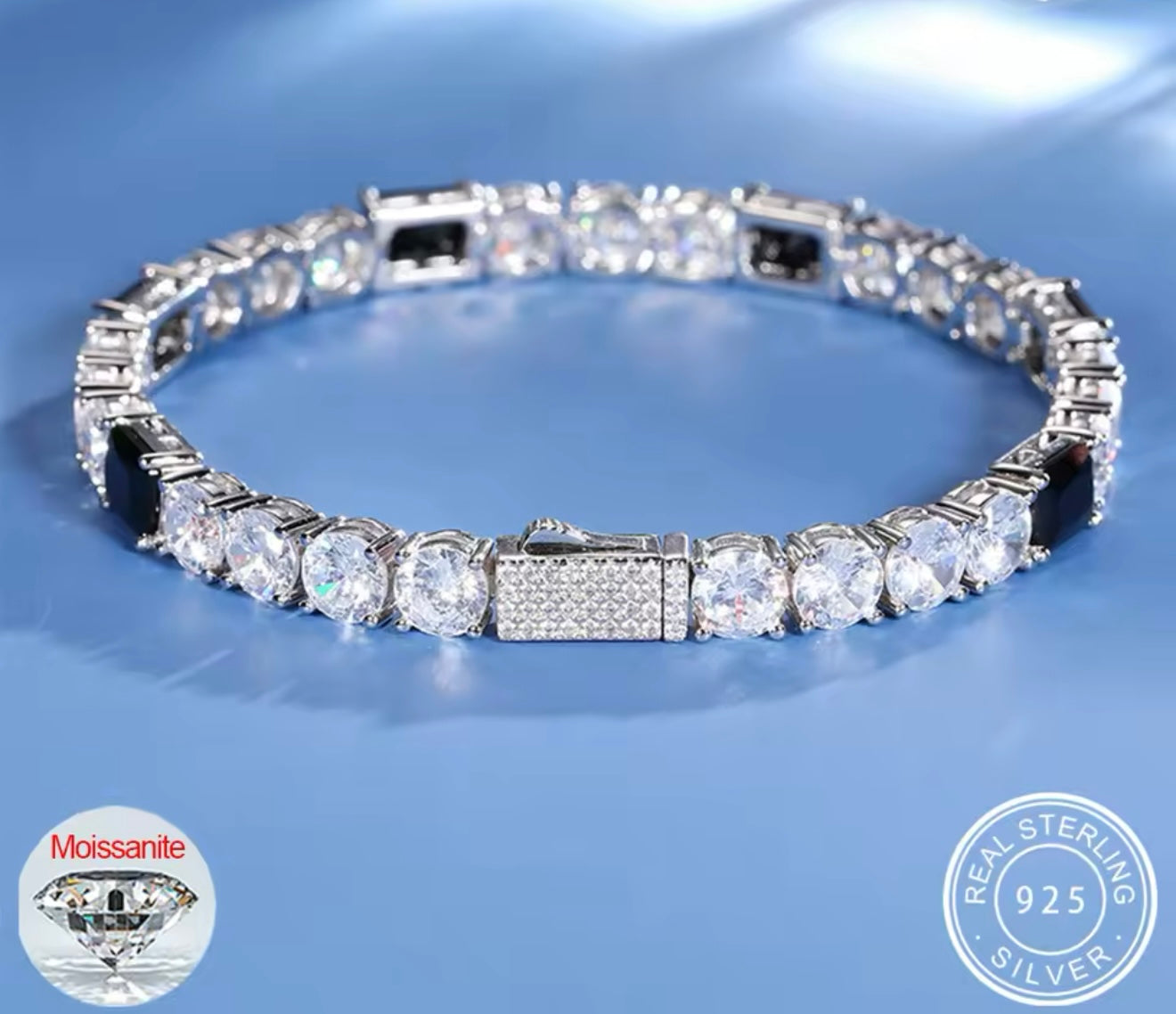 Moissanite 6MM Black Baguette Tennis Bracelet is designed for those who stand out. This premium tennis bracelet features a flawless arrangement of round-cut Moissanite stones, interwoven with striking black baguette accents, creating a dynamic contrast that exudes elegance and power.