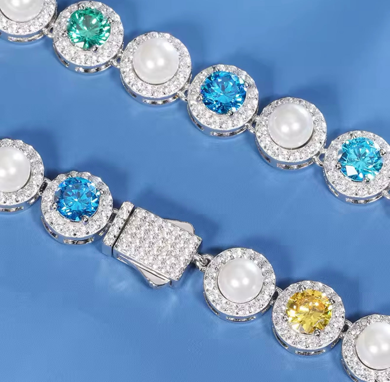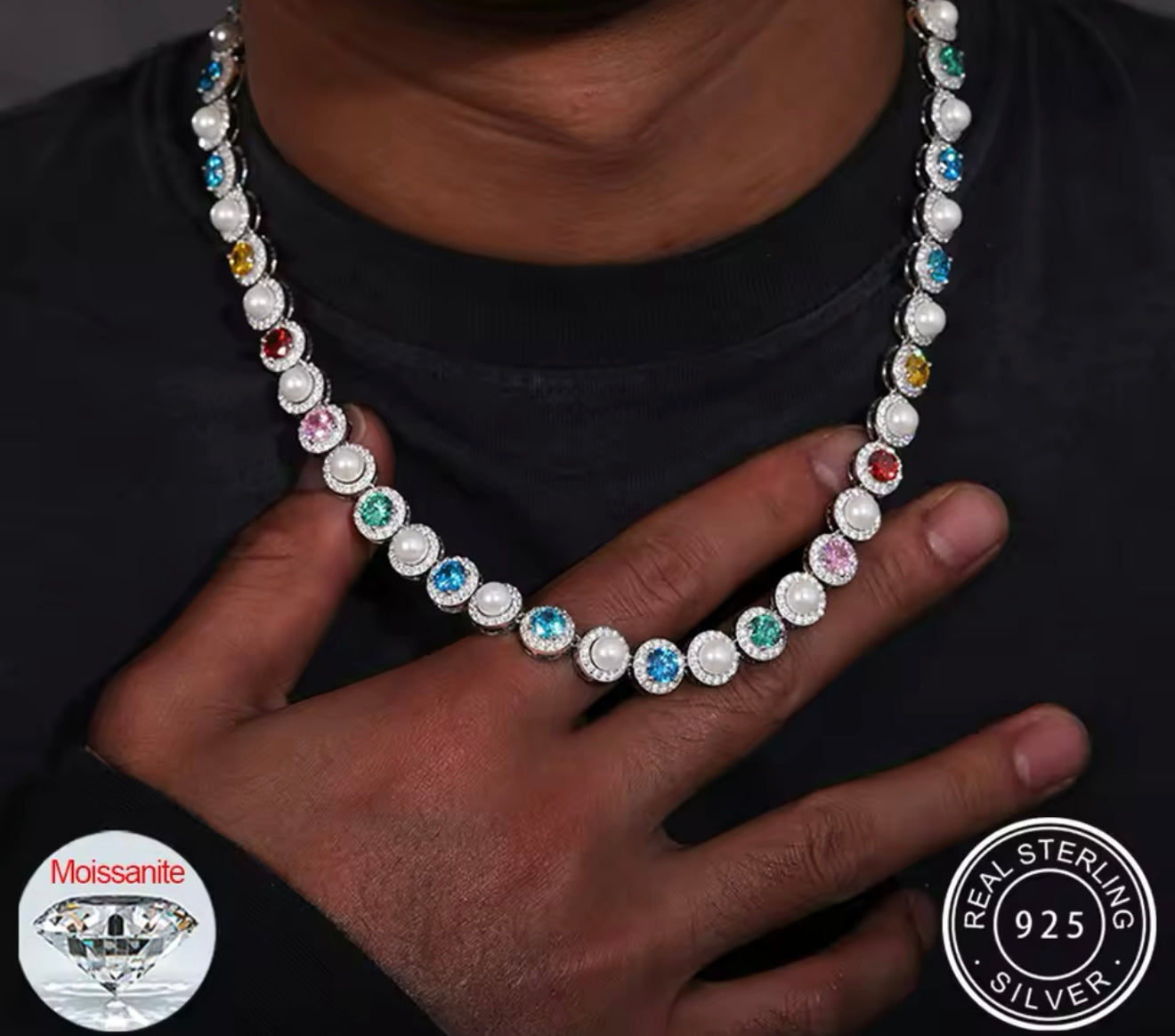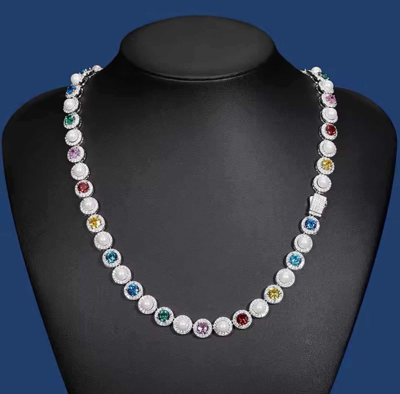 Elevate your style with the Moissanite Pearl & Multicolor Gem Tennis Necklace, a breathtaking fusion of elegance and brilliance. This luxurious piece features a dazzling array of high-quality moissanite stones that pass the diamond tester, ensuring an undeniable sparkle. Accentuated with luminous pearls and vibrant, multi-colored gemstones, this necklace offers a unique blend of sophistication and bold expression.