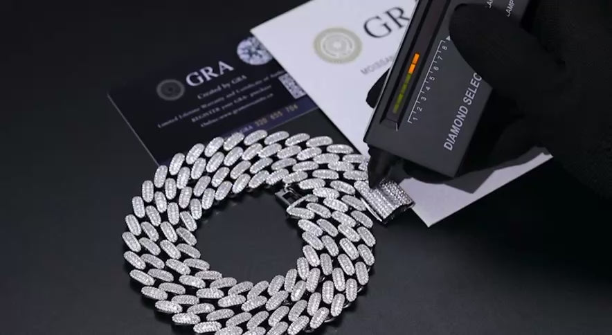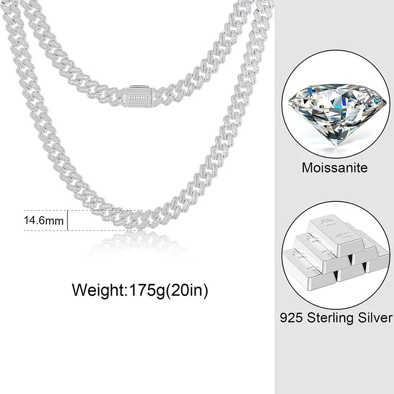 Ziehen Sie mit der unübertroffenen Brillanz unserer 14 mm großen Moissanite Miami Cuban Baguette-Halskette alle Blicke auf sich – fachmännisch gefertigt, um den kühnen Look von Diamanten ohne den Preis zu bieten.