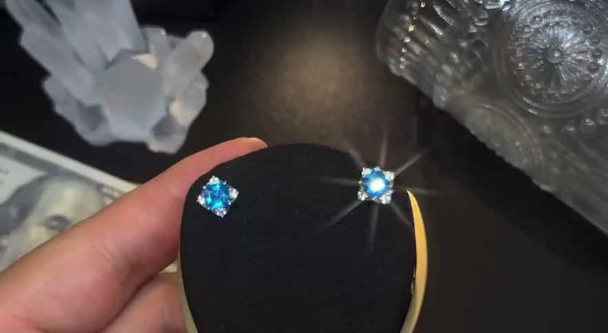 Luce una poderosa declaración con los pendientes de botón Moissanite Aqua Frost Cut (aprobados por el probador de diamantes). Estos radiantes pendientes lucen piedras centrales de moissanita color agua helada, rodeadas de un halo brillante similar al diamante, que les otorga una claridad y una luminosidad inigualables. Engastados con maestría en auténtica plata de ley 925, están diseñados para brillar toda la vida. Ya sea para un look elegante o para realzar tus atuendos de diario, estos pendientes añaden el toque perfecto de lujo audaz, a la vez que superan la prueba de diamantes con facilidad.