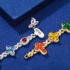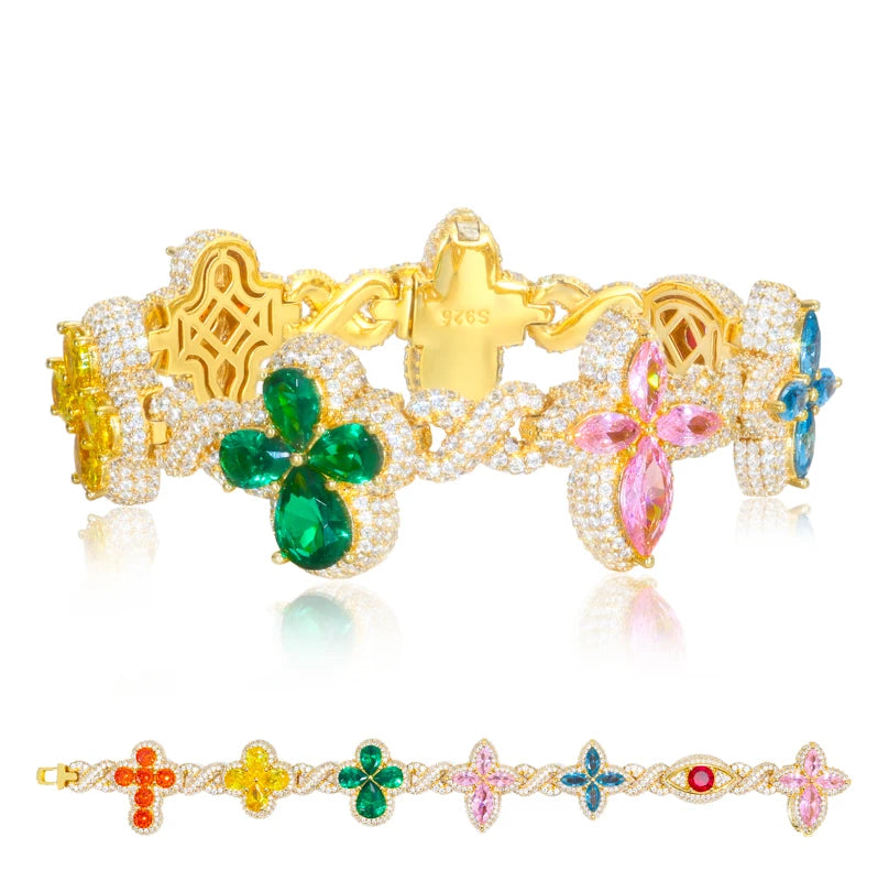 Made with solid 925 sterling silver, this bracelet features a mix of unique shapes — including flowers, crosses, and eye-inspired designs — all iced out for a brilliant shine that stands out anywhere.